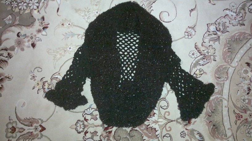 بعدش حاشیه ها رو به هم وصل کردم و دوختم و جلیقه آماده شد.... بعدش دیدم خیلی ساده اس شروع کردم از قسمت آستینا دوباره یه رج پایه بلند با کاموای ساده بافتم و باز با بافت توری برای لباس آستین بافتم
